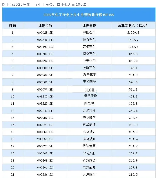 中國(guó)石化營(yíng)收最高共計(jì)21059.84億元,位居榜首。恒力石化排名第二,2020年?duì)I收1523.73億元。榮盛石化營(yíng)收1072.65億元排名第三。